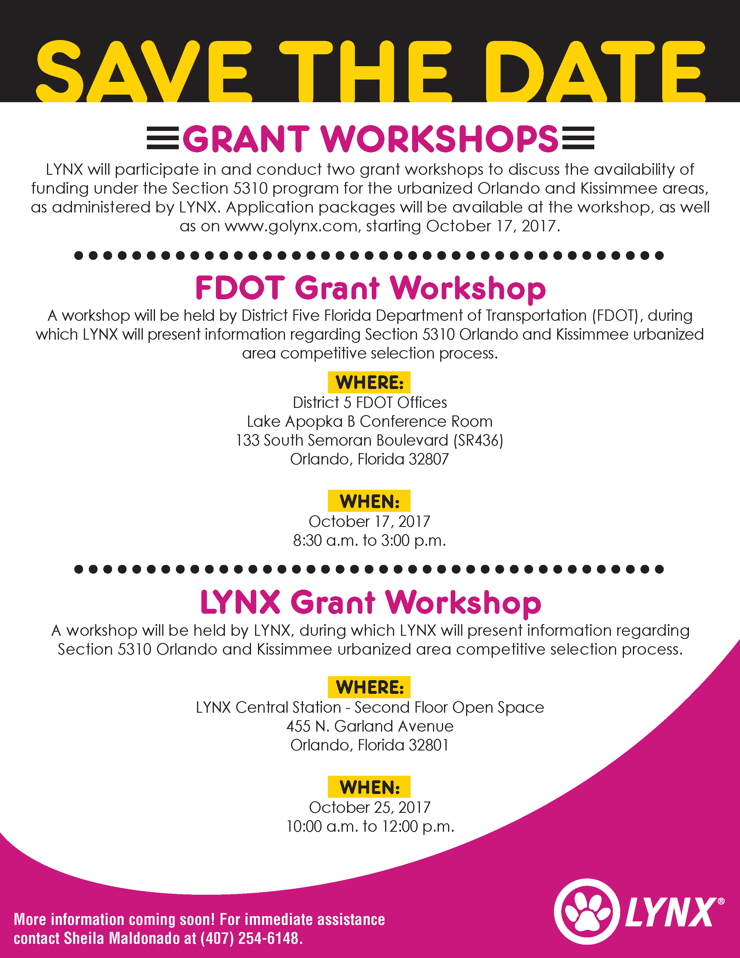LYNX will participate in and conduct two grant workshops to discuss the availability of funding under the Section 5310 program for the urbanized Orlando and Kissimmee areas, as administered by LYNX. Application packages will be available at the workshop, as well as on www.golynx.com, starting October 17, 2017.