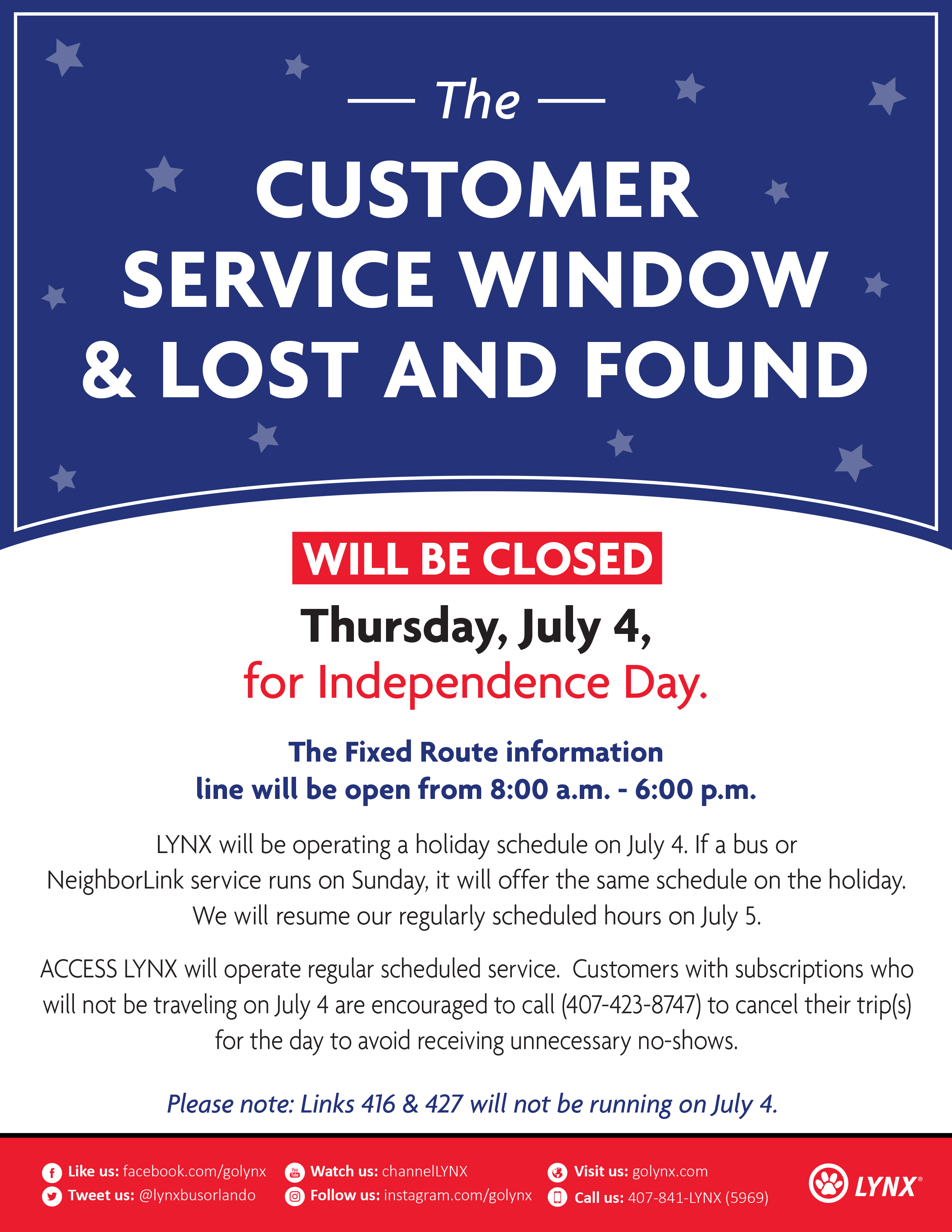 ACCESS LYNX will operate regular scheduled service. Customer with subscriptions who will not be traveling on July 4 are encouraged to call 407-423-8747 to cancel their trip(s) for the day to avoid receiving unnecessary no-shows.
