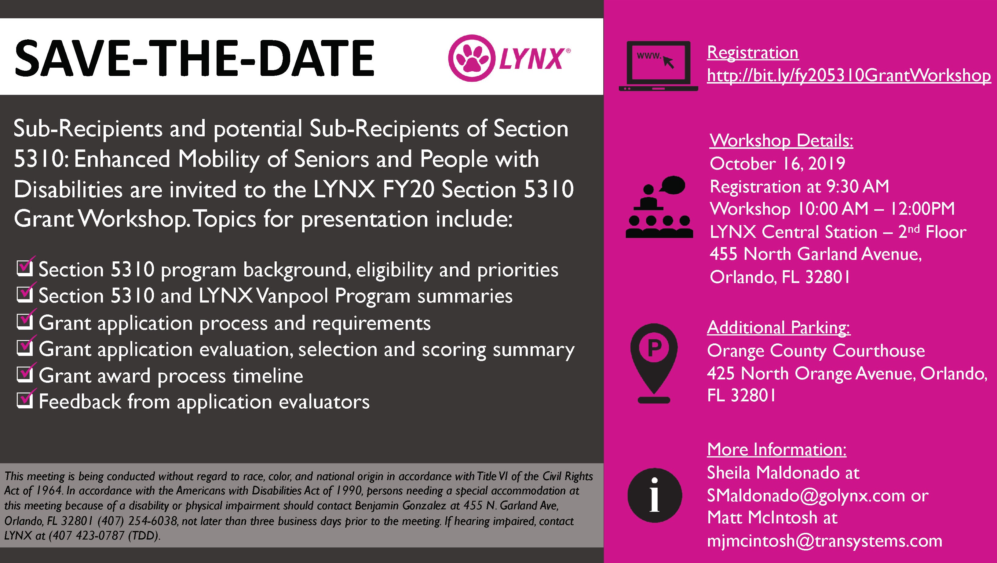LYNX FY20 Section 5310 Grant Workshop | News and Events | LYNX FY20 Section 5310 Grant Workshop Event Date(s) October 16, 201910:00 am - 12:00 pm AttachmentsLYNX-Save-the-Date5.pdf